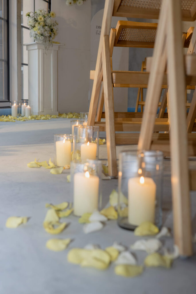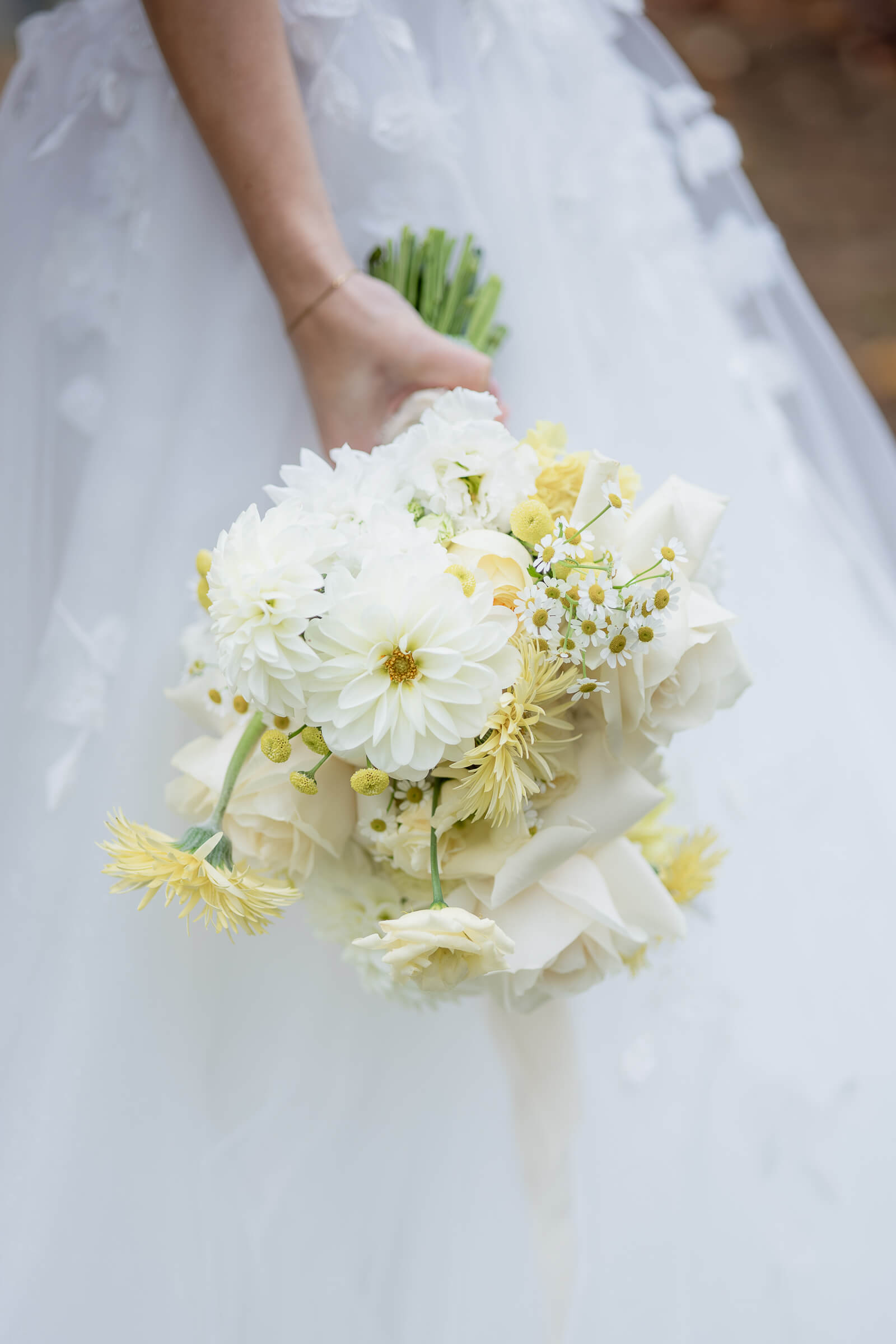 Braut schaut direkt in die Kamera, im Vordergrund ist die gelbe Blumendeko zu sehen